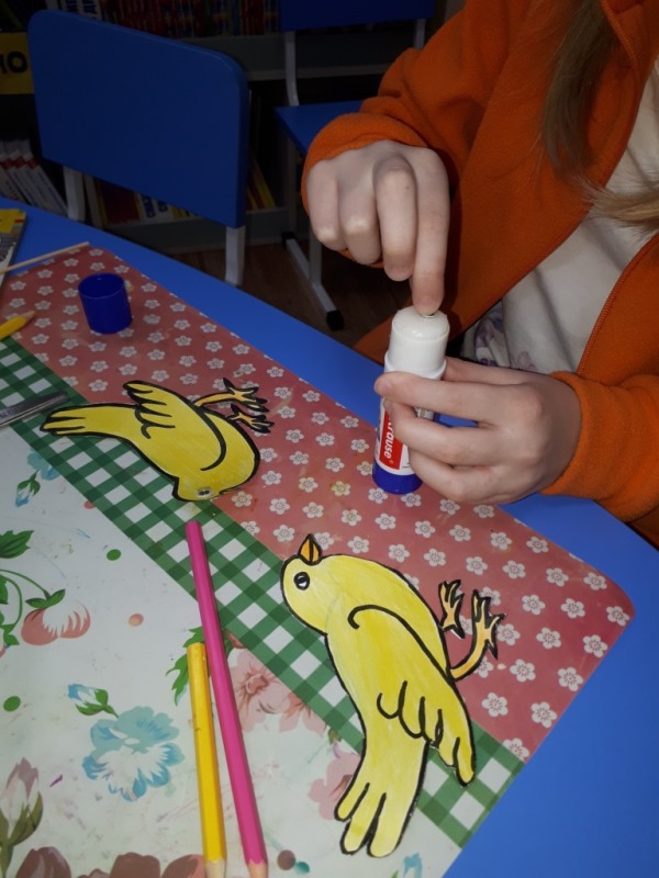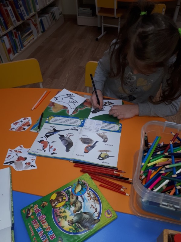 А в завершение ребята познакомились с выставкой, на которой были представлены книги о птицах и раскрасили и вырезали птиц, которыми оформили плакат.