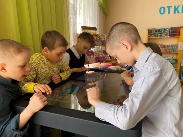 Ребята узнали, что в библиотеке есть интерактивный сенсорный стол, познакомились с его устройством. Экран был поделен на 6 рабочих зон, соответственно, у него собрались 6 команд по 2 человека. Школьники поняли, что с помощью этого гаджета можно развивать внимание, память, логику и мелкую моторику. Затем, команды выбрали три игры, способствующие развитию в том или ином направлении, а после их прохождения рассказали, почему был сделан именно такой выбор и были ли им полезны выбранные игры.