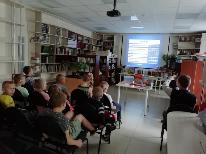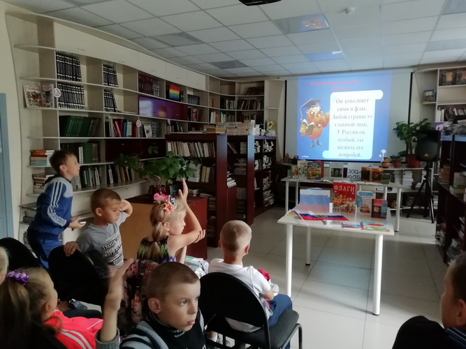 В завершение мероприятия, ребята приняли участие в интерактивной игре «Символы России». Игрокам предлагалось ответить на вопросы о флаге, гербе, гимне России. Также школьникам необходимо было вспомнить и другие неофициальные символы нашей страны. В качестве подсказки школьники могли использовать книги и пособия с выставки, приуроченной к 350-летию флага России «Три цвета России».