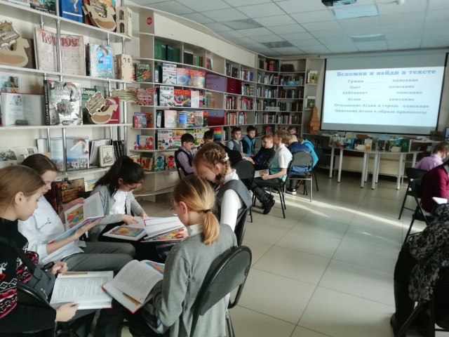 Следующим этапом игры стала работа с текстом. Дети должны были по моменту, изображенному на иллюстрации, вспомнить рассказ. Найти в тексте этот фрагмент и зачитать вслух. Также для четвероклассников было подготовлено несколько фраз, которые необходимо было найти в рассказе и зачитать.