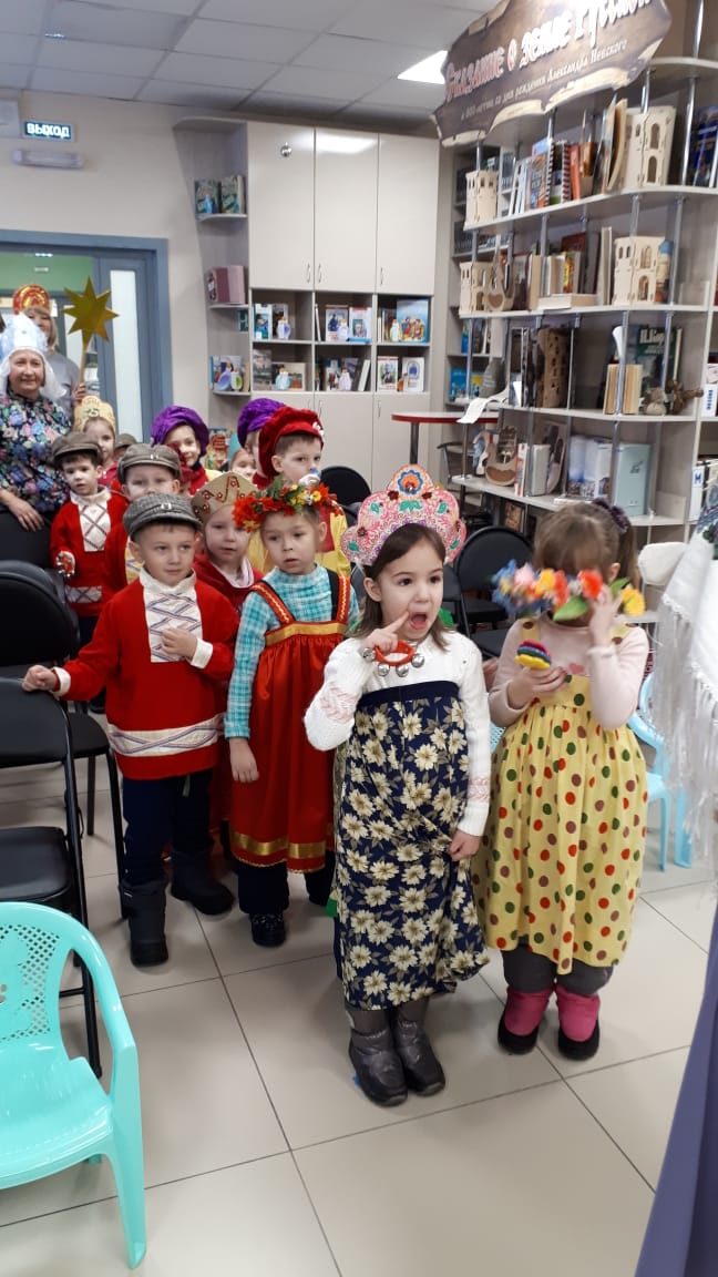 Уже не первый год дети под руководством воспитателей МБДОУ № 25 приходят в библиотеку с колядками. Воспитанники детского сада переодетые в яркие русские народные костюмы и под шумовые инструменты читали стихи и пели песни.