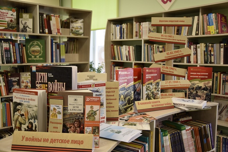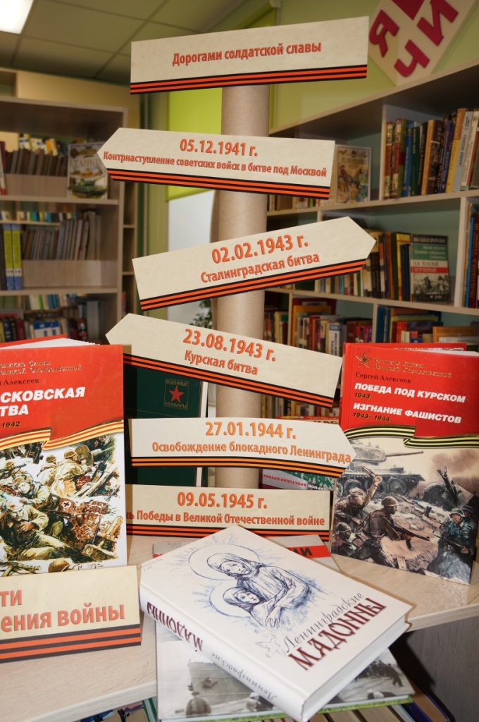 Разделы выставки разнообразные по форме и содержанию. Раздел «Дорогами солдатской славы» отражает великие победы Отечественной войны, в разделе представлена серия «Великие битвы Великой Отечественной»: Московская битва, подвиг Ленинграда, Сталинградская битва, Курская битва и др. Автор книг известный детский писатель Сергей Алексеев, участник Великой Отечественной войны рассказывает младшим школьникам о её главных битвах, описывает подвиг нашего народа в освобождении родной страны. Раздел выставки «У войны не детское лицо» знакомит ребят с книгой Аллы Суховой «Дети войны», о суровых испытаниях военного лихолетья, которые выпали на долю детей. Вчерашние школьники взяли оружие и вступили в смертный бой с фашистами. Книга призывает к честности, справедливости, защите Родины. В разделе «Бессмертный подвиг наших земляков» представлена книга Кемеровского издательства 2020 года – эта повесть Петра Ворошилова «Знаменщик полка». В основу повести лёг документальный материал о знаменщике 220-го гвардейского Запорожского полка, кузбассовце Николае Масалове, который рискуя жизнью, спас немецкую девочку. Подвиг его увековечен в известном всему миру Трептов-парке в Германии. Книга автора К.Ю. Галева «Герои Великой Отечественной войны»: Люди и подвиги из серии «Популярная научно-практическая энциклопедия современных знаний» отражает события накануне войны, ход войны, рассказывает о полководцах победы, подвиге нашего народа, а нашла эта книга своё место в разделе «Наши герои Великой войны». На выставке также представлены книги: большая детская энциклопедия «Великая Отечественная война», детская энциклопедия «Танки», где написано о победоносном танке Великой Отечественной – танке-34 и др., а в разделе «В книжной памяти мгновения войны» расположились художественные произведения о войне.