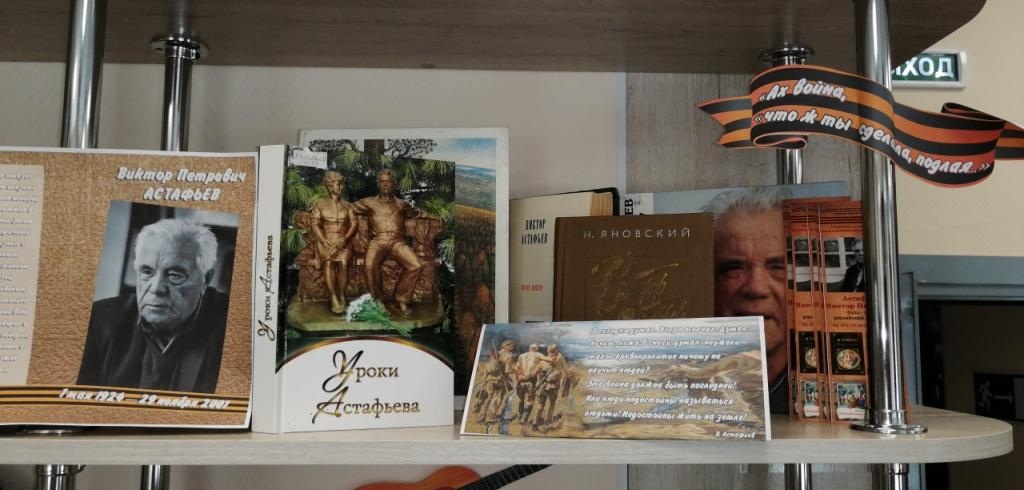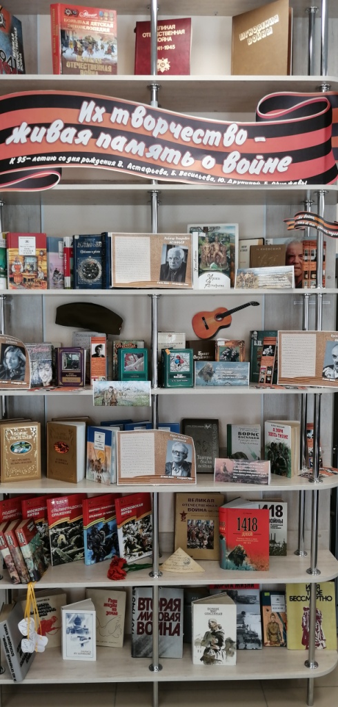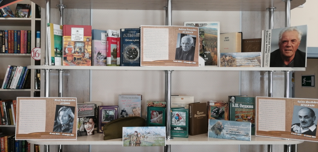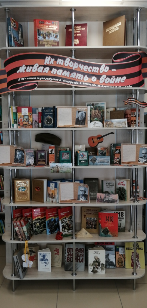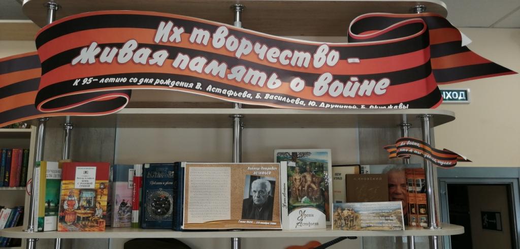 Выставка-портрет «Их творчество – минувших лет живая память» объединила имена писателей, родившихся в мае 1924 г., прошедших Великую Отечественную войну и посвятивших своё творчество великим и страшным годам 1941-1945. Эта выставка посвящёна 95-летию со дня рождения В. Астафьева, Б. Окуджавы, Ю. Друниной, Б. Васильева.