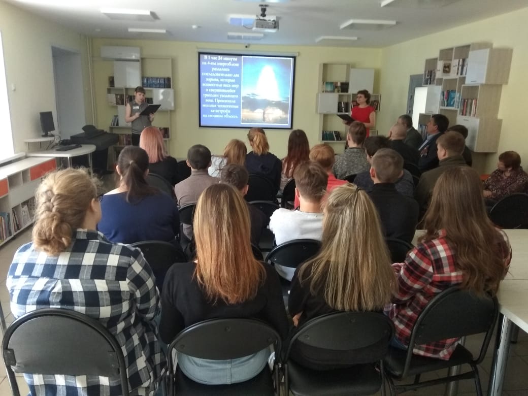 Библиотекари Арзамаскина И.В. и Жукова А.В. рассказали студентам Междуреченского горно-строительного техникума о самой масштабной катастрофе в истории человечества. Познакомили ребят с хроникой чернобыльских событий после взрыва на АЭС. Студенты узнали о воздействии радиации на всё живое, о пожарных, которые погибли при тушении пожара, возникшего после взрыва и т.д.