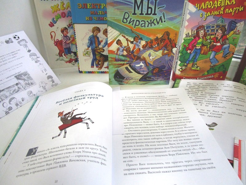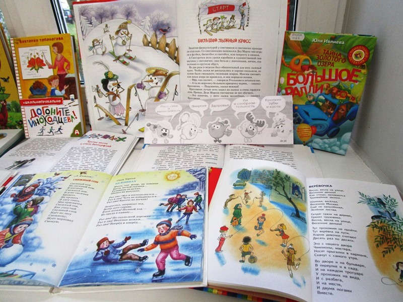 Герои сказок, стихотворений, рассказов в представленных на выставке книгах делают зарядку, играют в футбол и хоккей, прыгают через веревочку и мчатся на коньках. И даже снеговики и снеговички из повести-сказки Андрея Усачева «Школа снеговиков» устраивают хоккейные матчи и лыжный кросс, а мальчишка-робот Электроник из повести В. Велтисова учится играть в волейбол.