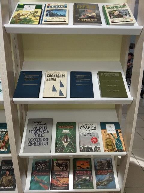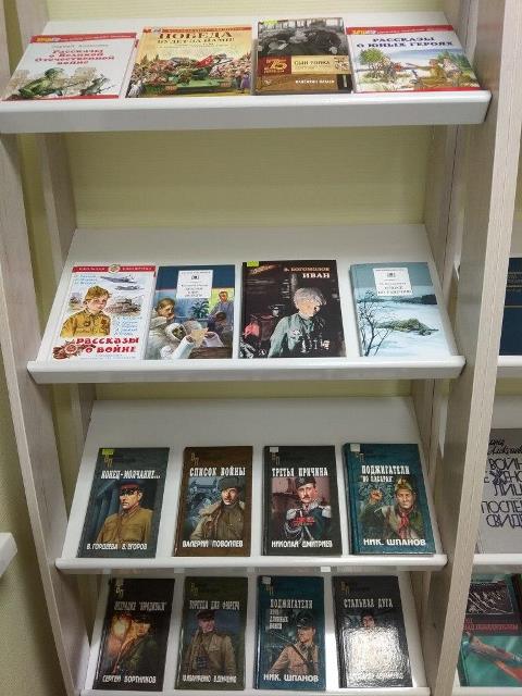 На выставке представлены стихи и проза о великом подвиге нашего народа, отдельно оформлен раздел литературы о войне и для маленьких читателей.