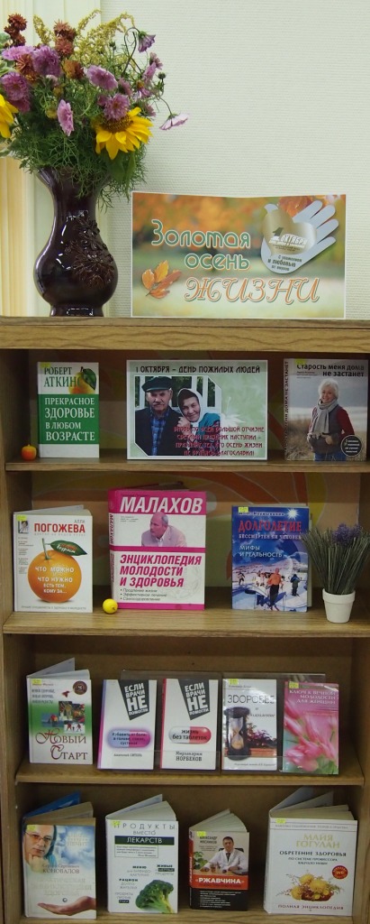 К этой дате библиотекарями отдела досугового чтения подготовлена выставка-просмотр «Золотая осень жизни». На выставке представлены книги, содержащие рецепты молодости, здоровья и долголетия. Из материалов выставки вы узнаете, как прожить жизнь без таблеток и как сохранить здоровье в любовь возрасте, о том, какие существуют мифы о долголетии. Вместе с энциклопедией молодости здоровья Геннадия Малахова вы сможете выбрать свой путь оздоровления, узнаете об омолаживающих гимнастиках, об очищении голоданием и о многом другом. А книга доктора Александра Мясникова «Ржавчина». Что делать, чтобы сердце не болело» – настоящая находка для каждого человека. Она расскажет, как сохранить здоровье самого главного нашего органа – сердца. Она познакомит читателя с тем, как функционирует сердце, что можно сделать для профилактики сердечно-сосудистых заболеваний, каковы их симптомы, факторы риска, стоит ли обращаться к народной медицине, когда это делать категорически нельзя.