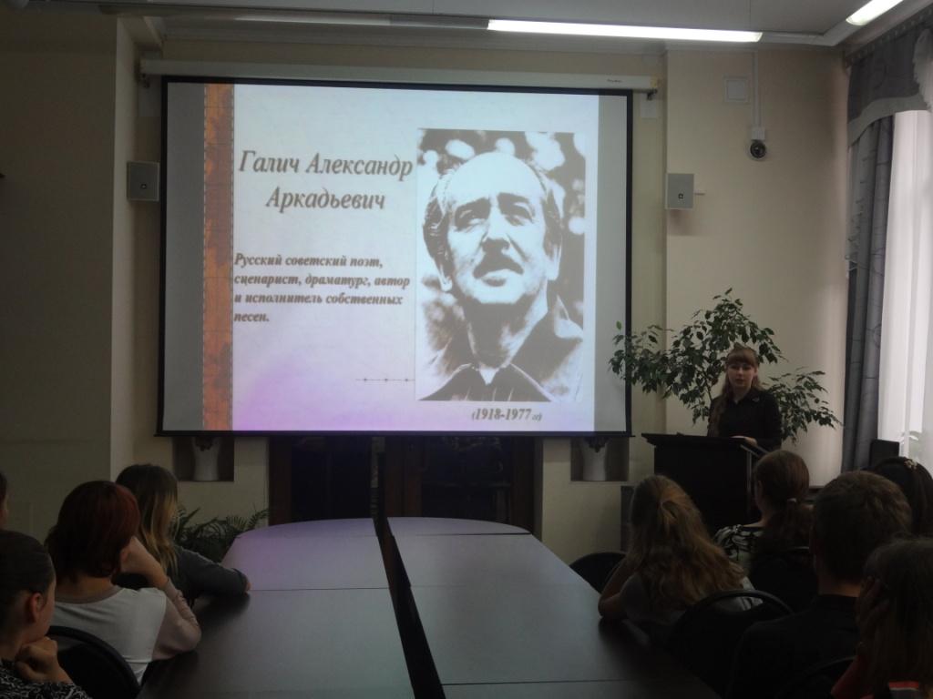 Библиотекарь Жукова Алена Владимировна рассказала студентам о детстве и юности, о личной жизни и творчестве Александра Галича. Учащимся техникума был показан видеоролик, где Александр Галич исполнял песню «Облака», а также был показан документальный фильм о последних днях жизни поэта.