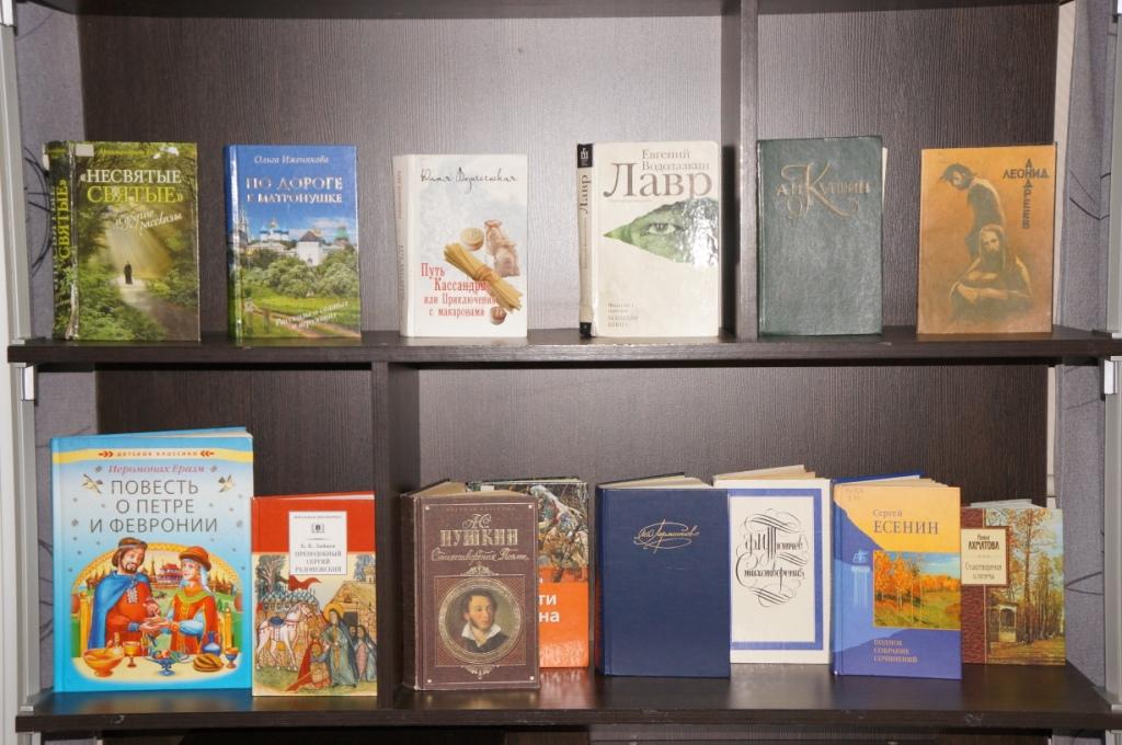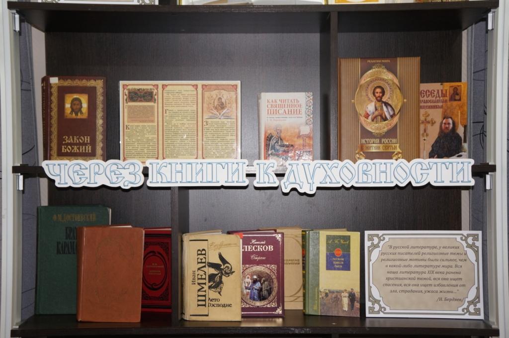 На выставке представлена литература, посвященная в первую очередь русскому первопечатнику Ивану Федорову и первой печатной книге «Апостол». Также, на выставке представлены произведения великих русских писателей и поэтов – Достоевского, Лескова, Чехова, Пушкина, Лермонтова и других, чьи имена вписаны золотыми буквами не только в историю мировой литературы, но и в историю Православной Церкви. И это не случайно, как пишет Н.А. Бердяев: «Вся наша литература XIX века ранена христианской темой, вся она ищет спасения, вся она ищет избавления от зла, страдания, ужаса жизни для человеческой личности, народа, человечества, мира. В самых значительных своих творениях она проникнута религиозной мыслью».