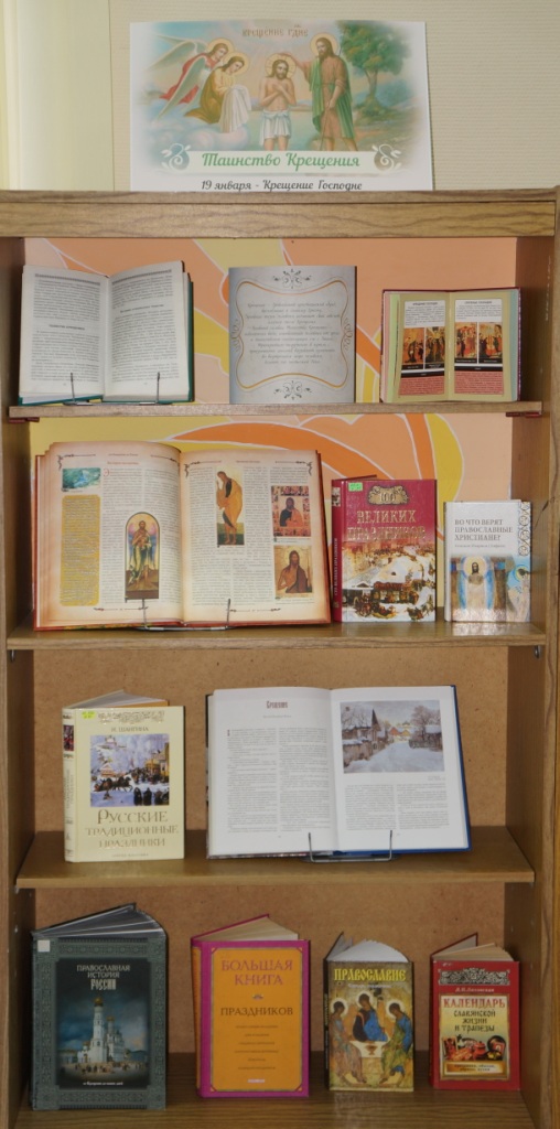 К этой дате в Центральной городской библиотеке оформлена книжная выставка «Таинство Крещения», из которой вы узнаете много интересного о празднике Крещения Господня: прежде всего о том, что означает само понятие «таинство крещения», когда оно появилось, как простая вода становится святой? Кроме того из материалов выставки вы узнаете об истории, традициях и обрядах этого праздника, какие особенные блюда готовят в этот день и многое другое.