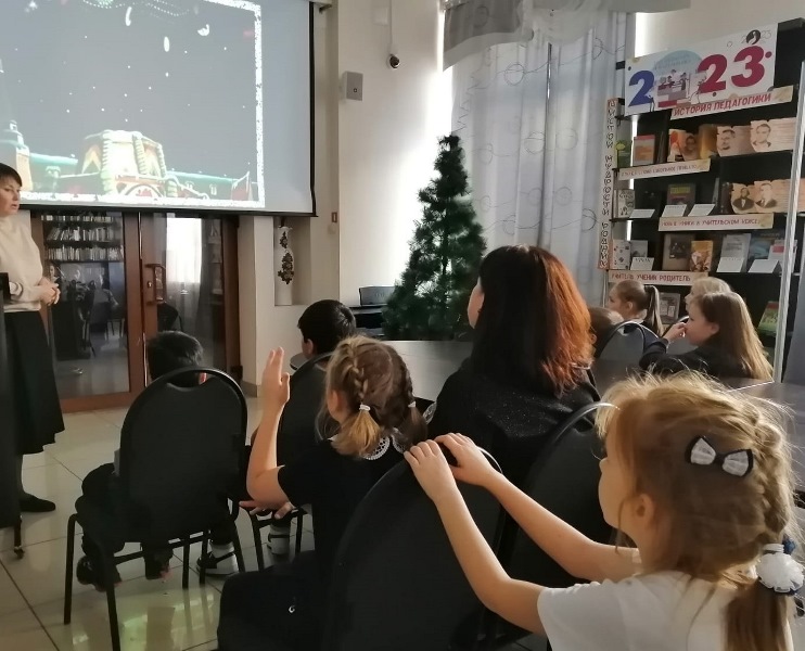 В старом году присутствующие послушали интересные истории появления в России главных персонажей Нового года – Снегурочки и Деда Мороза. Узнали, как появилась в домах россиян новогодняя ель и историю известной всем песенки «В лесу родилась елочка». Вспоминали, почему главными атрибутами праздничного стола стали мандарины и оливье. Послушали первое новогоднее обращение генерального секретаря ЦК КПСС Брежнева Л.И. Программу разбавили кричалки, смешные анонимки и загадки. Также ребята приняли участие в литературной викторине «В мире зимних сказок».