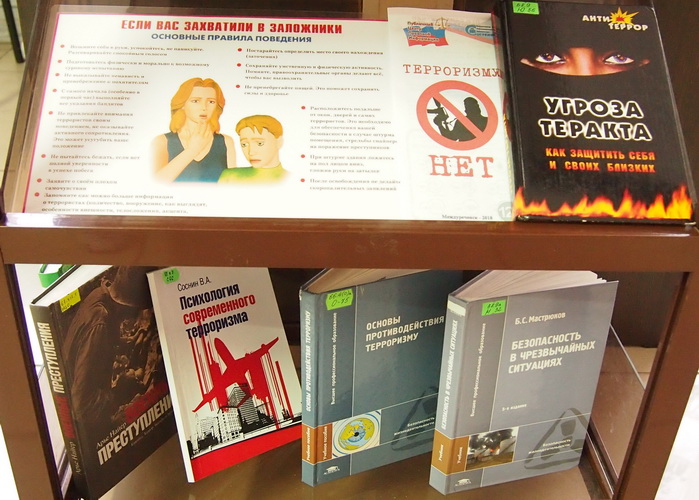 В Центральной городской библиотеке на книжной выставке «Будущее без терроризма, терроризм без будущего» представлены книги, которые помогут вам узнать, какие бывают виды современного политического, религиозного и националистического терроризма, какие террористические общества наиболее активно действуют в современном мире, какие ставят перед собой задачи и цели. Здесь вы найдете советы и способы личной безопасности при террористической угрозе. Если вас заинтересовали книги, журналы на нашей выставке или другая информация, то вы можете рассказать о ней друзьям.