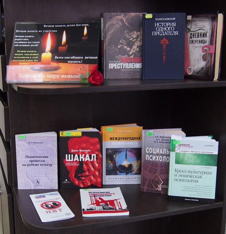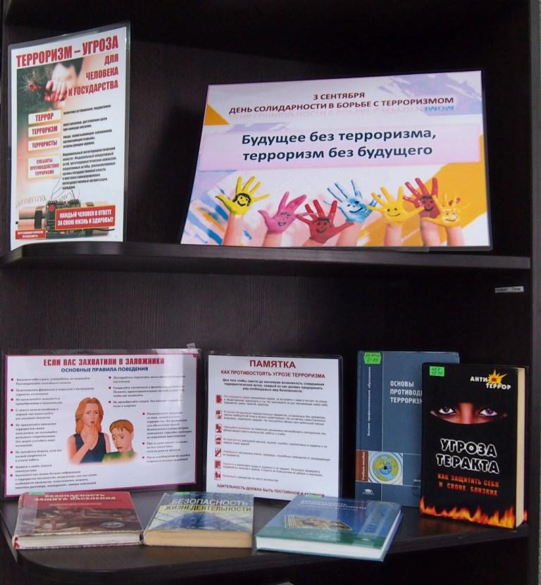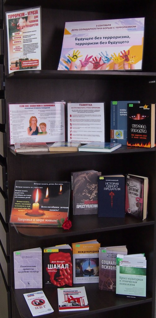 На книжной выставке под названием «Будущее без терроризма, терроризм без будущего», расположенной в отделе делового чтения Центральной городской библиотеки, представлены книги о безопасности в чрезвычайных ситуациях, о профилактике терроризма, советы и рекомендации как защитить себя и своих близких. Угроза терактов существует, и лучше всего быть к ней готовыми. Также из представленных книжных изданий читатели получат ответы на вопросы: что значит понятие «терроризм», когда и где он возник, и каков он в современном мире.