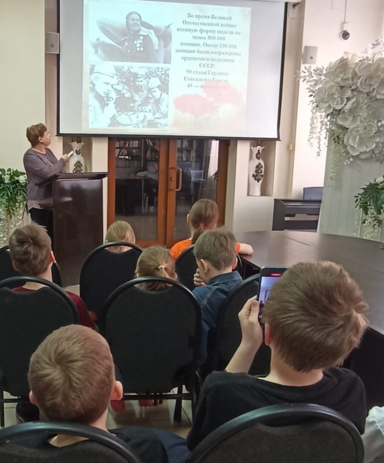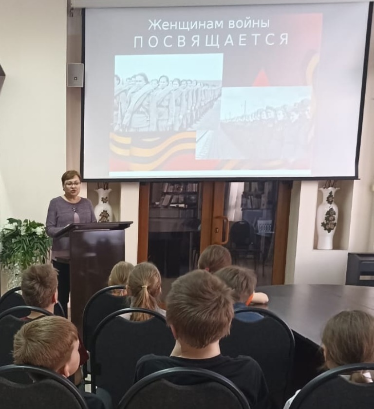 У войны не женское лицо, но в период Великой Отечественной войны в армии служило 800 000 женщин. Никогда ещё на протяжении всей истории человечества столько женщин не участвовало в войне. Библиотекарь с помощью презентации рассказала воспитанникам МКУ «Центр Семья» о роли женщин на войне, об их подвиге на поле боя и в тылу. Ребята узнали о героической и трагической судьбе разведчиц партизанского отряда Зои Космодемьянской и Веры Волошиной, пулемётчиц Алии Молдагуловой и Маншук Маметовой, снайпера Людмилы Павличенко, поэтов Юлии Друниной и Ольги Берггольц. Участники встречи почтили минутой молчания всех не вернувшихся героев Великой Отечественной…