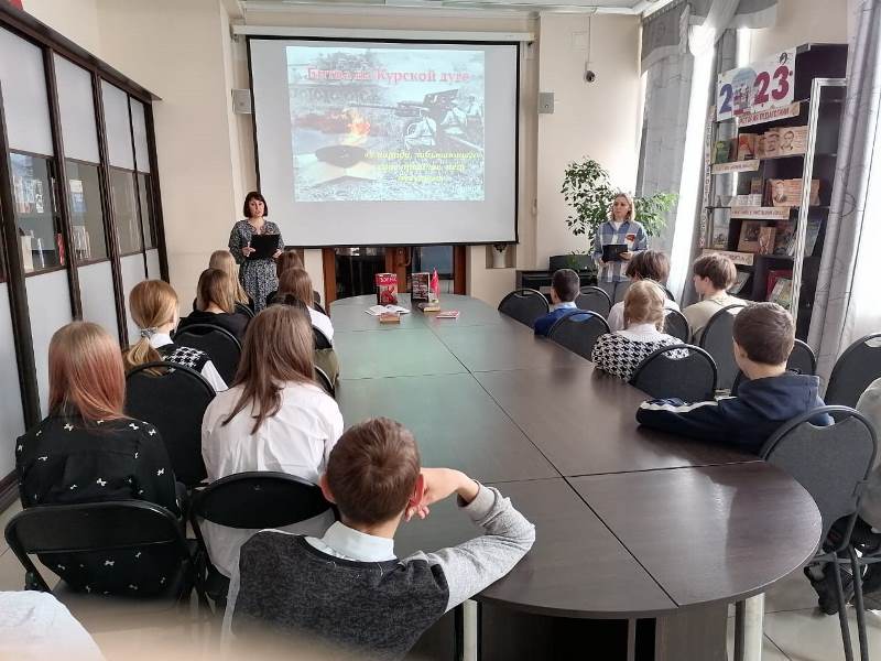 Гостями библиотеки, в преддверии Дня Победы и восьмидесятилетия со дня Курской битвы, стали учащиеся СОШ №22 7 класса. Во время Великой Отечественной Войны было много важных битв и сражений. Но были очень крупные по своему масштабу и значению. Одной из таких битв была «битва на Курской дуге». Слушатели узнали о первом в истории войн встречном танковом сражении, о подготовке и ходе битвы под Прохоровкой. Рассказ ведущей сопровождался показом мультимедийной презентации с демонстрацией фрагментов документальных фильмов и военной хроники.
