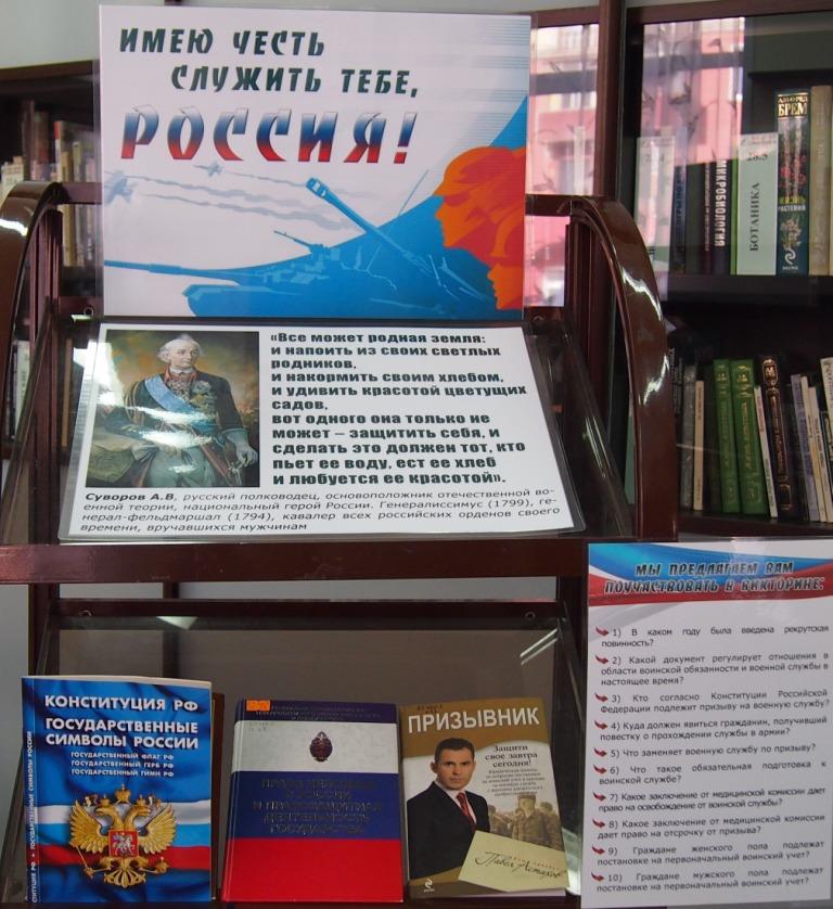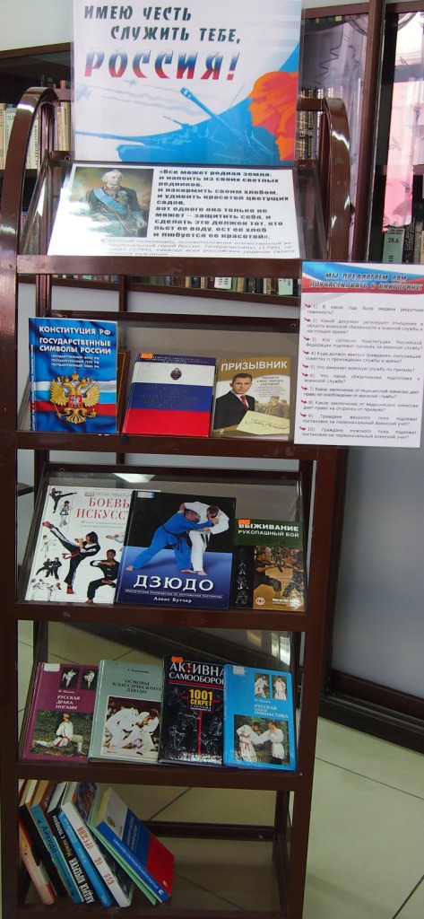С 13 по 18 ноября в отделе «Публичный Центр Правовой Информации» Центральной городской библиотеки оформлена книжная выставка «Имею честь служить тебе, Россия», которая поможет будущим солдатам и их родителям в решении вопросов правового характера.