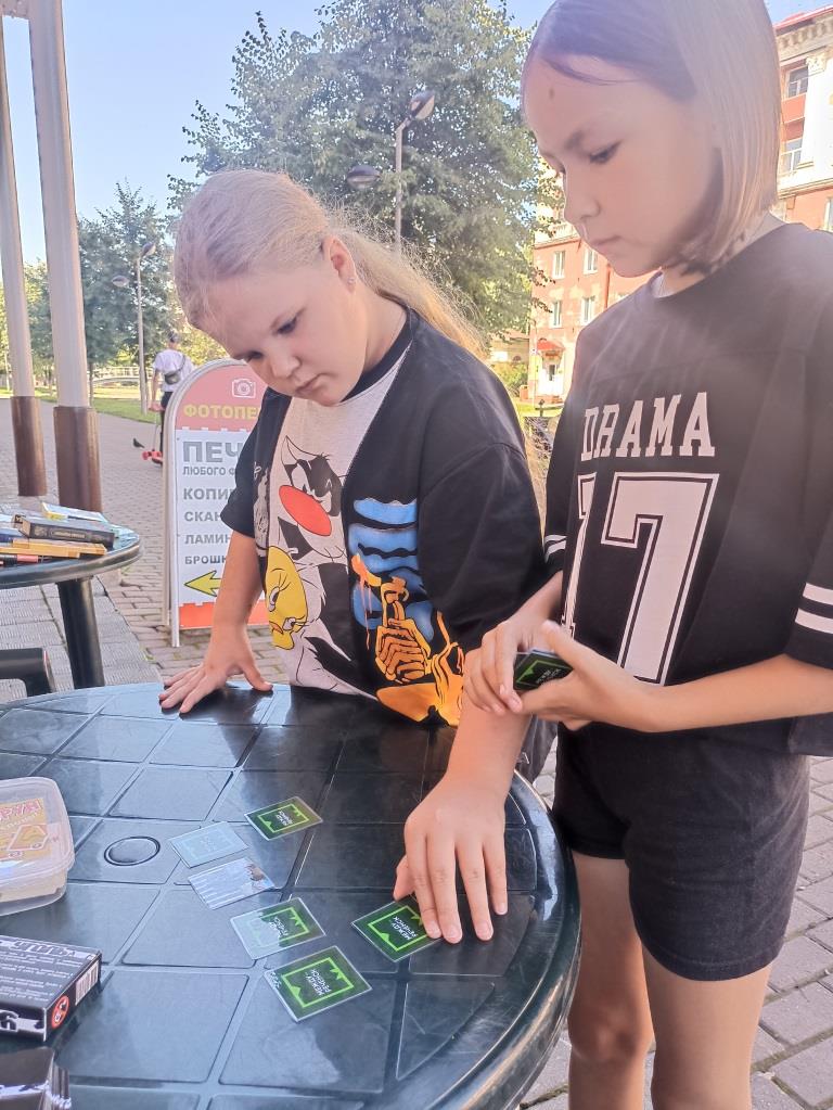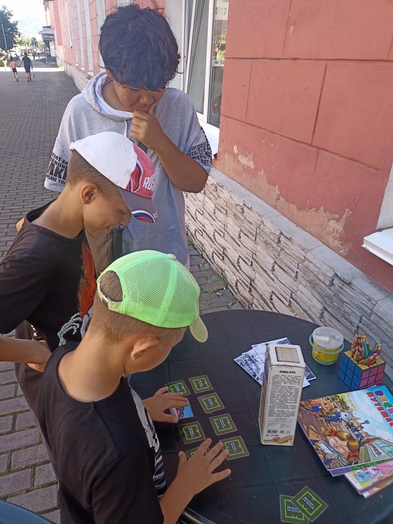 Библиотекари предлагали прохожим сыграть в игру «Найди пару: памятные места Междуреченска». Игроки должны были находить пары одинаковых карточек с изображением местных достопримечательностей путем запоминания их расположения на столе. Такие игры тренируют образное мышление и зрительную память, а также знакомит участников с уникальными местами города.