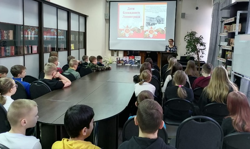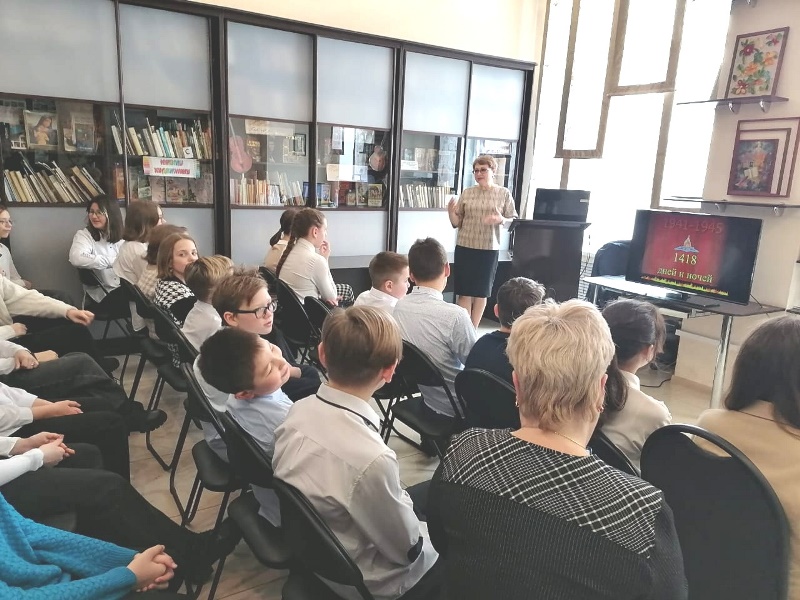 Урок памяти «Ленинградский ломтик хлеба», посвящённый 80-летию прорыва блокады Ленинграда. Рассказывая об испытаниях ленинградских детей, на чьи хрупкие плечи легла тяжесть невзгод, бедствий, горя военных лет, библиотекарь использовала кадры из документальной хроники, зачитывала воспоминания детей из книги «Дорога жизни». Учащиеся узнали, что дети их возраста потушили десятки тысяч зажигалок, сброшенных с самолётов, не один пожар в городе, дежурили морозными ночами на вышках, носили воду из проруби на Неве. Основной акцент был сделан на блокадном хлебе. Какие были нормы на взрослого человека и ребёнка, на работающего и солдата. Ребята дополнили рассказ библиотекаря о судьбе Тани Савичевой, чей блокадный дневник стал живым напоминанием о тяжёлых блокадных днях и выставлен в Государственном музее истории Санкт-Петербурга.