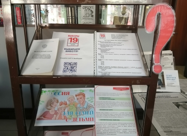 На выставке представлены документы, которые помогут Вам поэтапно узнавать информацию об избирательной кампании, как будут проходить выборы в сентябре 2021 г., познакомиться с депутатом по нашему избирательному округу и его программой, об изменениях в законодательстве с 1 сентября 2021 г.