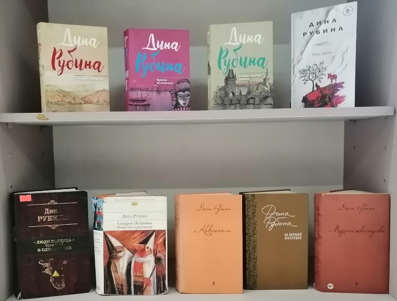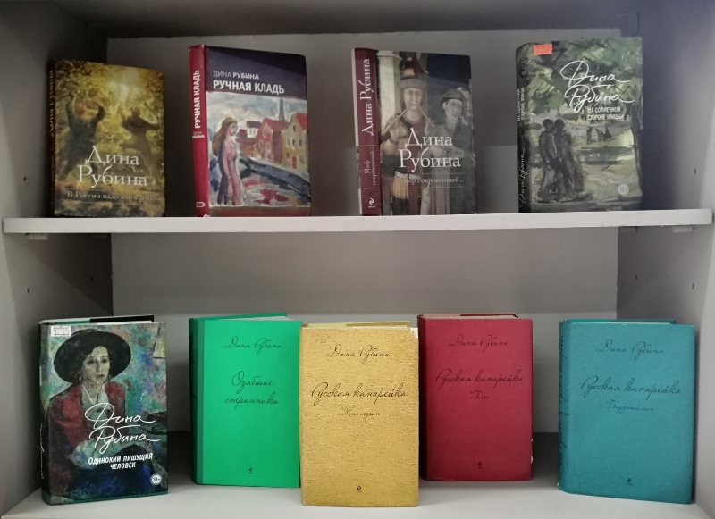 На выставке представлены произведения известной русской писательницы, редактора, киносценариста, члена Союза писателей Узбекской ССР, Союза писателей СССР, международного ПЕН-клуба, Союза русскоязычных писателей Израиля – Дины Ильиничны Рубиной. Книги автора – это произведения малой прозы, например, сборники рассказов «Сахарное свечение», «Сквозь сеточку шляпы», «Крепче веселитесь», а также крупные произведения: романы «Наполеонов обоз», «Русская канарейка», «Синдром Петрушки».