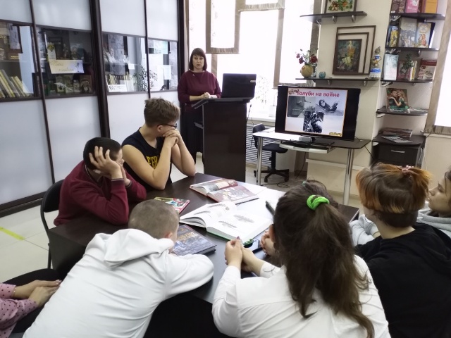 Встреча была посвящена братьям нашим меньшим, которые в годы Великой Отечественной войны воевали рядом с советскими воинами. С помощью видео и презентации библиотекарь напомнила ребятам о том, что лошади, собаки, лоси, кошки, голуби и даже верблюды, как и люди совершали ратные подвиги – и гибли, как и люди. И, возможно, благодаря их слаженной работе и безоговорочному исполнению своего долга – помогать человеку в любой ситуации, они приблизили долгожданную победу над фашистскими захватчиками.