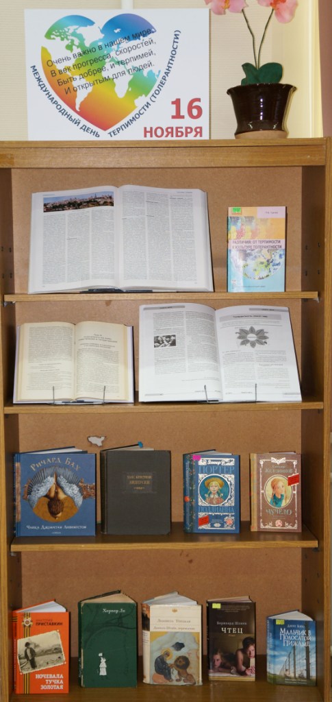 В преддверии Международного дня толерантности в Центральной городской библиотеке начала свою работу книжная выставка «Единство разных». На выставке представлена литература не только раскрывающая понятие толерантности, но и книги которые учат толерантному отношению. Во многих художественных произведениях легко можно проследить тему терпеливого отношения к людям, придерживающимся отличного от других мнения, вероисповедания, поиска компромисса и интереса к жизни во всем её многообразии.