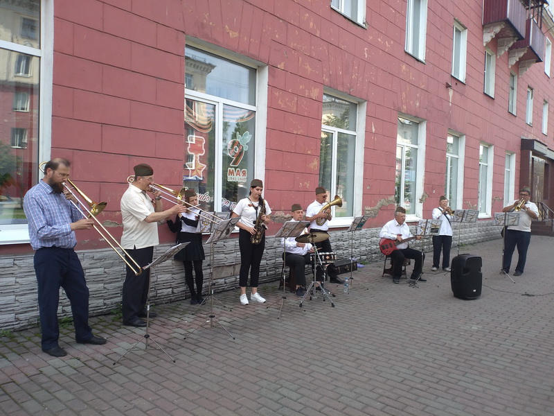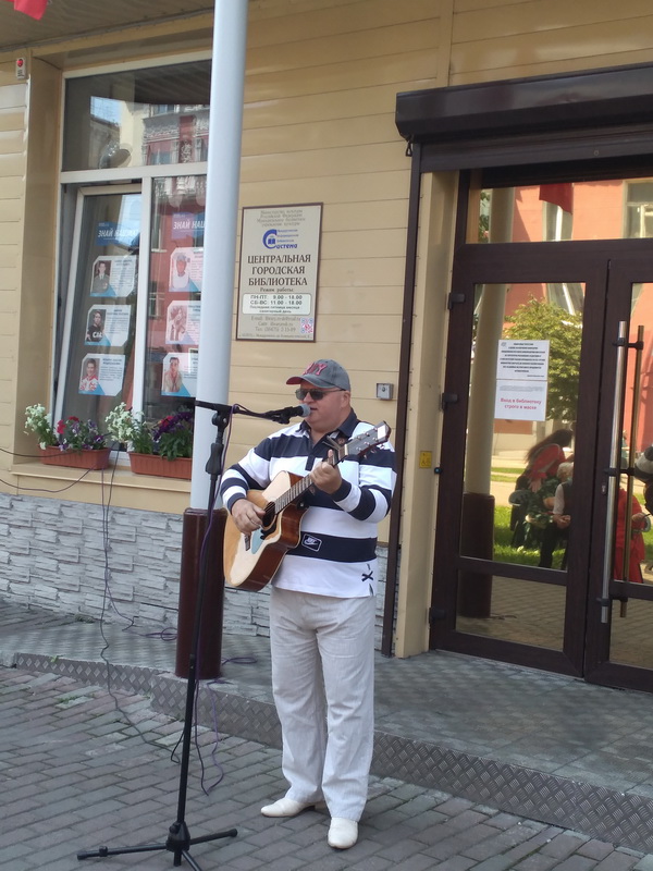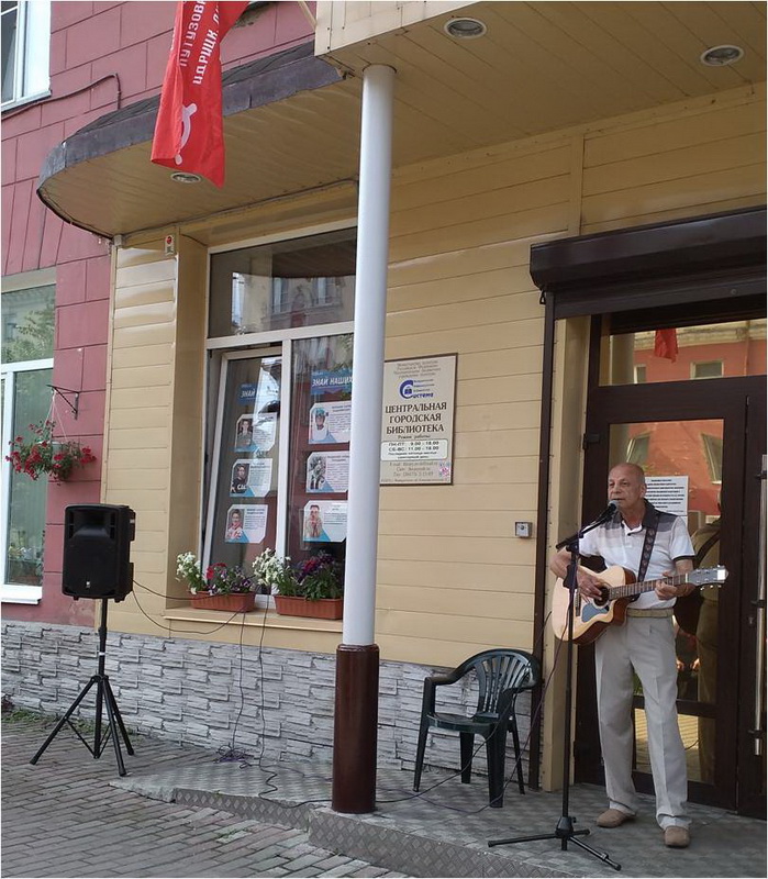 У стен библиотеки состоялась долгожданная очная встреча поэтов, литераторов и просто междуреченцев. Участники поэтических клубов «Полифон», «Ритм», «Литератор» и «Гармония» исполняли стихи и песни, посвящённые 75-ой годовщине Победы в ВОВ. Приятным сюрпризом для горожан стало выступление духового оркестра ДК им. Ленина, который исполнил несколько музыкальных произведений военной тематики. Не забыли поэты и о Дне рождении нашего города, посвятив и этому событию своё творчество.