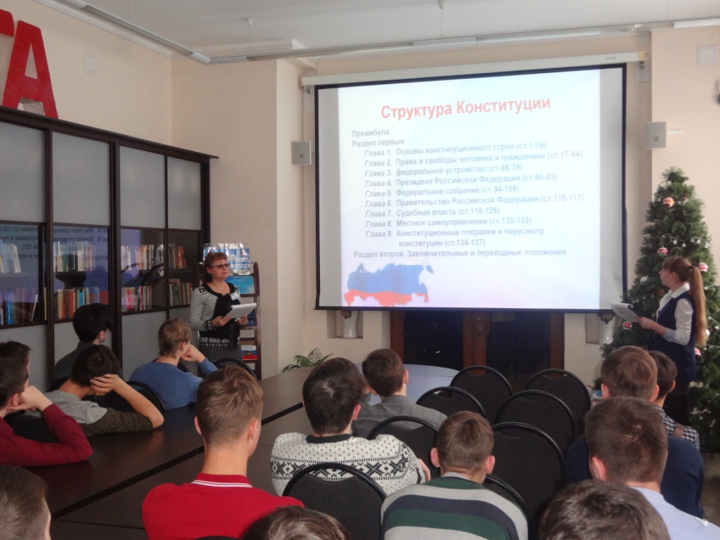 Целью и задачей мероприятия стало расширение знаний о конституционных основах нашего государства, формирование понимания необходимости знания Конституции как основного закона, воспитание уважительного отношения к Конституции, воспитание чувства гордости, уважения и любви к своей Родине, уважение законов, участие в жизни государства. Библиотекари с помощью слайд-презентации «Изучаем Основной Закон нашей страны» рассказали студентам Междуреченского горно-строительного техникума об истории создания Конституции РФ, познакомили с её структурой, с основными правами, свободами и обязанностями граждан РФ. Библиотекари обратили внимание ребят на книжную выставку «Конституция – Закон, по нему мы все живём!», на которой представлены издания о символах нашего государства и о Конституции РФ. В заключение встречи демонстрировался ролик о современной Конституции и была проведена игра-викторина, в которой ребята показали хорошие знания по данной теме.