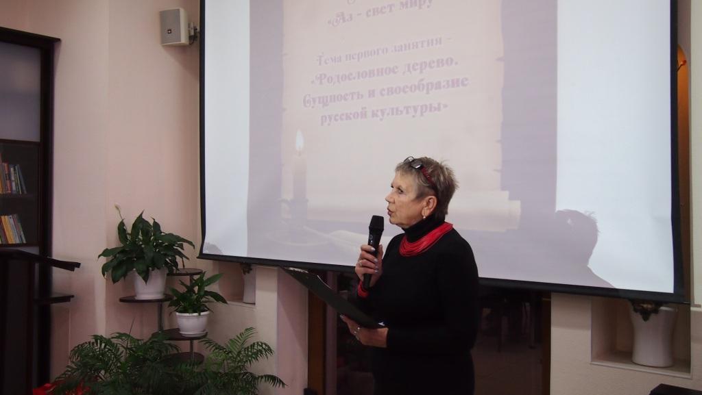 Карелина В.Г., библиотекарь Междуреченской Информационной Библиотечной Системы, руководитель лектория «Аз-свет миру» провела первое занятие по теме «Родословное дерево – сущность и своеобразие русской культуры».
