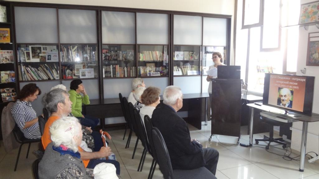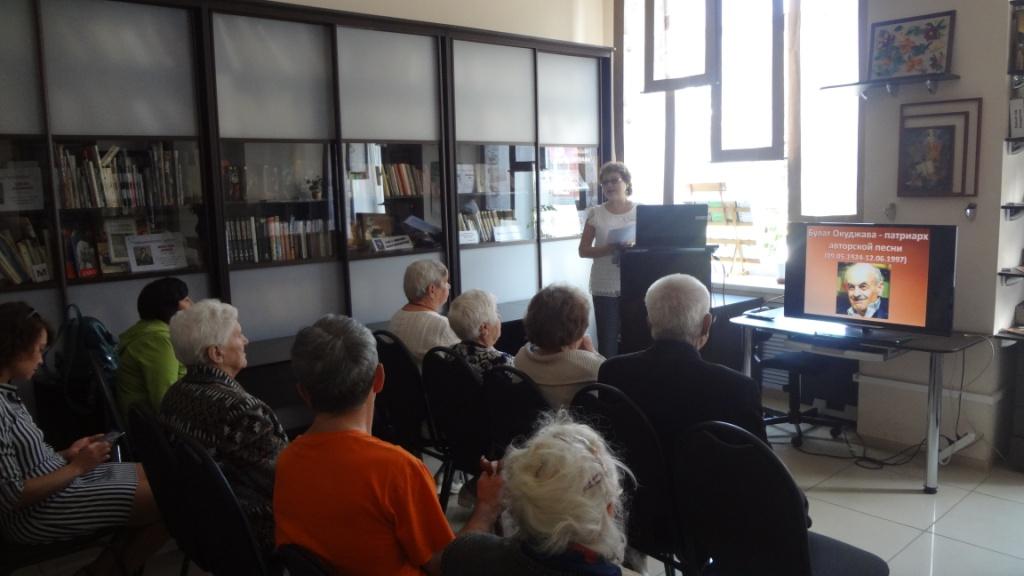 Библиотекарь Арзамаскина Ирина Владимировна познакомила присутствующих с непростой, но в тоже время интересной жизнью поэта и трагической судьбой его родителей. С большим удовольствием участники клуба слушали «Ах, Арбат, мой Арбат», «Виноградную косточку в теплую землю зарою…», «Ваше Величество, женщина», «Любовь и разлука», «Я дежурный по апрелю», «Молитва» и другие песни в исполнении самого автора.