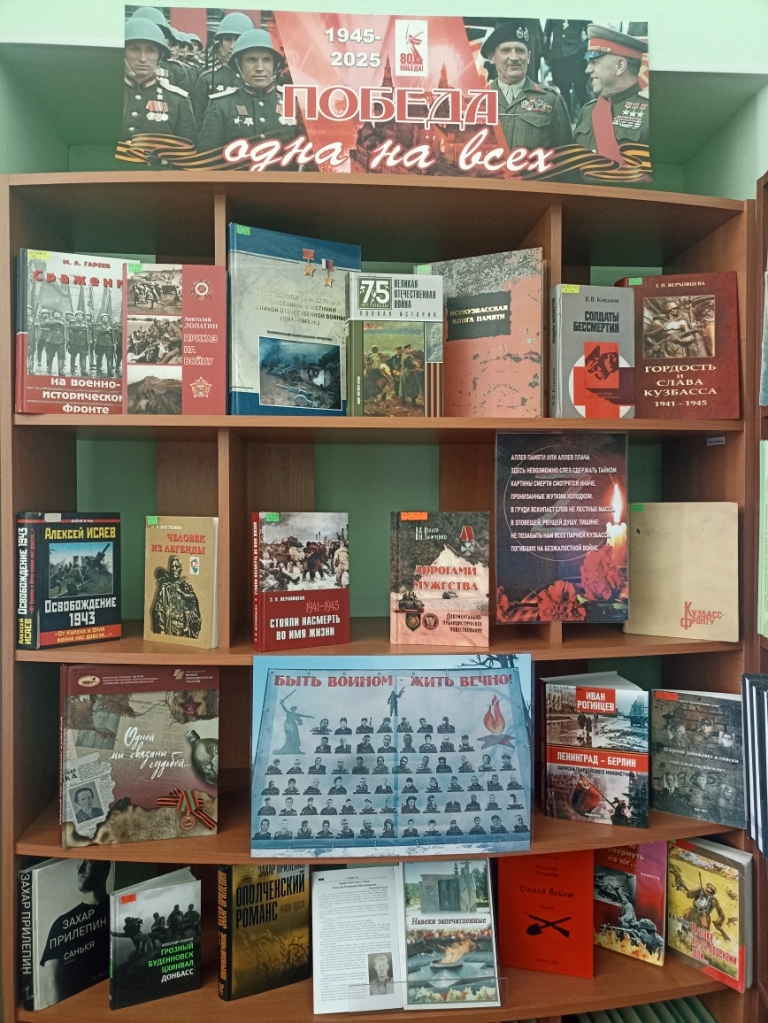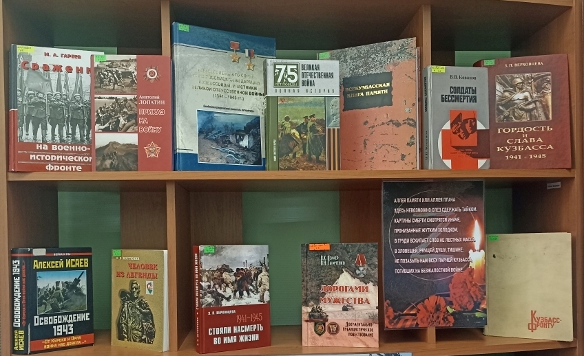 Книги, представленные на выставке – документальные, публицистические и художественные, помогут совершить исторический экскурс в героическое прошлое нашей страны, узнать о славных победах советских, российских войск, о вкладе кузбассовцев в общую Победу, познакомиться с важнейшими событиями войны через архивные фотографии, воспоминания фронтовиков, исторические памятники, которые сыграли решающую роль в истории Отечества.
