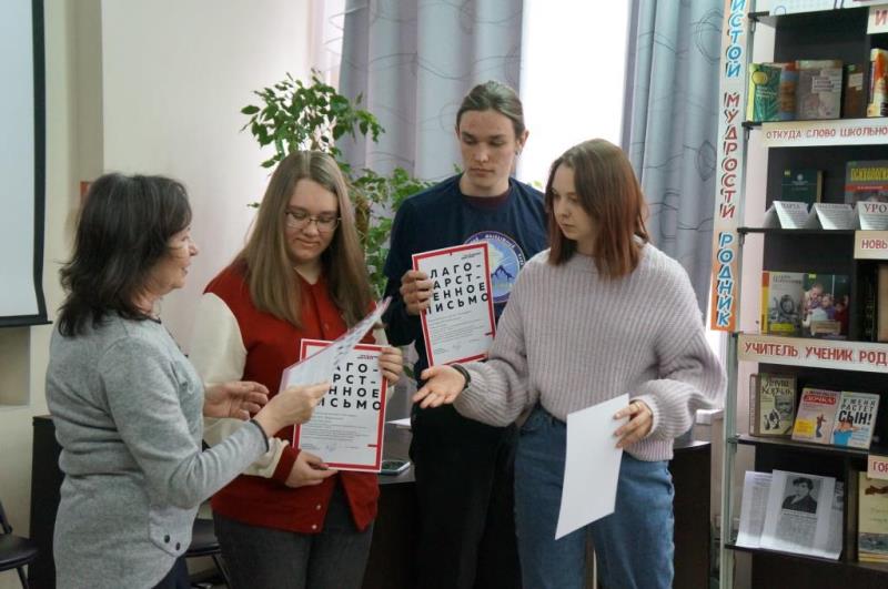 Были вручены благодарственные письма партнерам Тотального диктанта в Междуреченске – тем, без кого не состоялся бы праздник русского языка. Организует акцию в городе традиционно Междуреченская Информационная Библиотечная Система, в экспертный совет входят филологи МБОУ «Лицей №20». Участников Тотального диктанта на главной площадке – в малом зале Дворца культуры «Распадский» – уже не первый год встречают исполнением музыкальных композиций коллективы Детской хоровой школы № 52. Ребята – волонтеры Центра развития добровольчества «Доброе время» – раздали всем участникам фирменные бланки для диктанта и фирменные сувенирные ручки с логотипом Тотального диктанта.