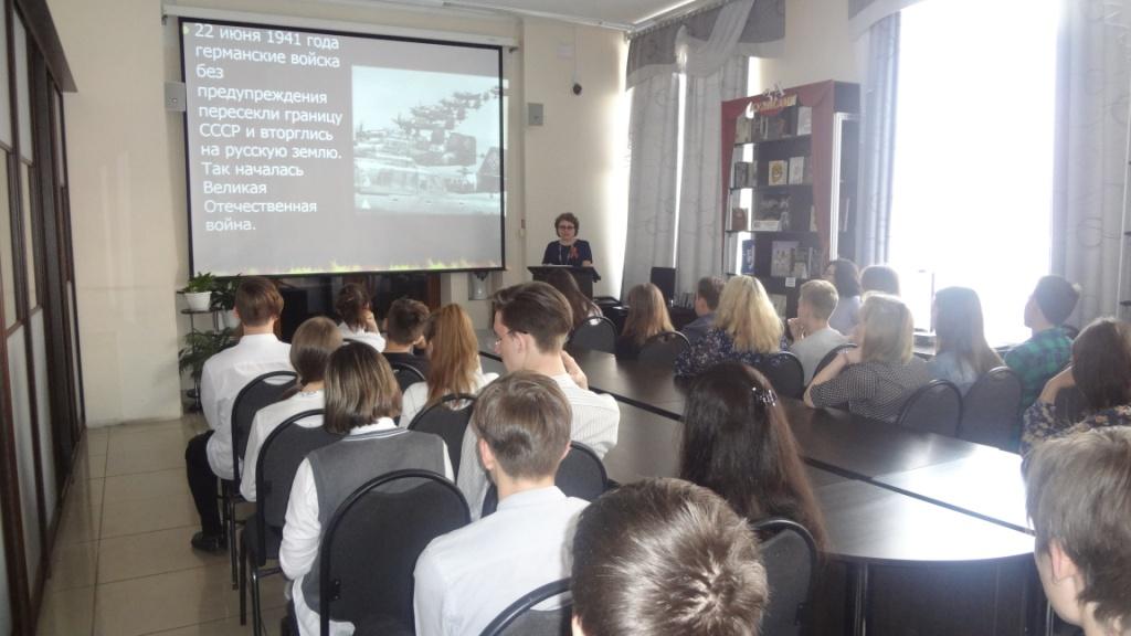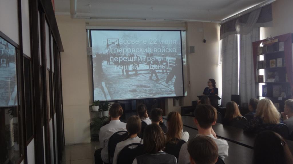 Библиотекарь Арзамаскина Ирина Владимировна рассказала учащимся города об основных этапах Великой Отечественной войны: о блокаде Ленинграда, о битве за Москву, о Сталинградской битве, о Курской дуге, о значении этих битв в Победе над фашизмом. Напомнила, что первыми приняли удар защитники Брестской крепости, которые сдерживали натиск фашистской армии целый месяц! Что на оккупированных территориях фашисты создавали лагеря смерти, в которых проводили медицинские эксперименты над людьми, морили их голодом, жгли в крематориях и т.д. Ребята узнали о программе «Холокост», по которой фашисты планировали уничтожить славянское и еврейское население, о том, какие человеческие потери понесло наше государство. В ходе мероприятия демонстрировались слайды и документальные кадры военной хроники. Под звук метронома почтили погибших минутой молчания.