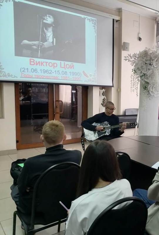 Студентам Междуреченского горностроительного техникума были представлены личности бардов, как известные, так и малознакомые для их возраста. Разговор шёл об истории зарождения бардовской песни, о тех, кто стоял у её истоков – Александр Вертинский, Юрий Визбор, Булат Окуджава. Ребятам рассказали о тех, кто творил в трудные 60-70-е годы ХХ века и тех, чьё творчество было под запретом – Владимир Высоцкий, Александр Галич. Эти песни не для развлечения. Их нельзя слушать между делом. Бардовская песня – живая песня, она спрашивает, советует, рассказывает, печалится и веселится. Больше всего присутствующих заинтересовало творчество Виктора Цоя и Игоря Талькова. Ребята и сами любят петь под гитару и некоторые из них исполнили песни, в том числе, всем известные произведения Виктора Цоя.