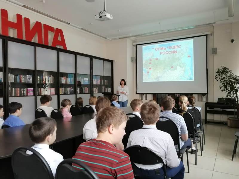 На виртуальной экскурсии «Семь чудес России» учащиеся 5 класса СОШ №23 познакомились с историческими, культурными и природными чудесами современной России. Список «Семь чудес России» составили в 2008 году путем народного голосования. По канатной дороге ребята поднялись на высочайшую гору Эльбрус, попали в таинственную Долину гейзеров, полюбовались самым глубоким и древнейшим озером Байкал, а на плато Мань-Пупу-Нёр послушали, как гудят между собой великаны, превращенные в Столбы выветривания. Еще в коллекцию семи чудес добавили Собор Василия Блаженного, Петергоф и скульптуру «Родина – мать зовет!».