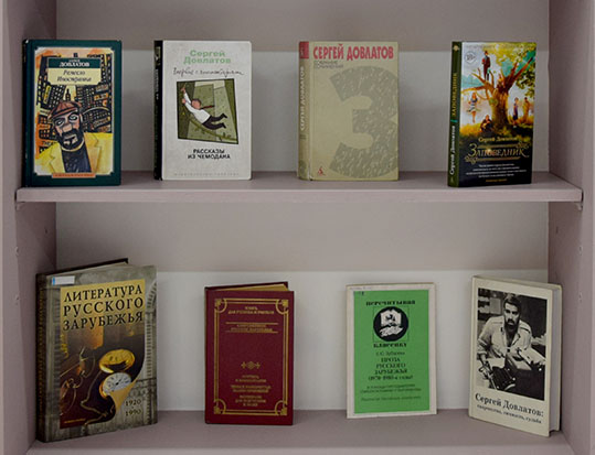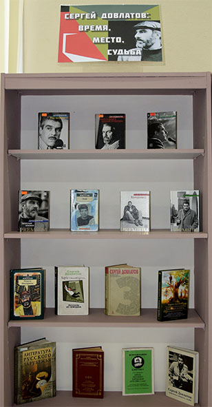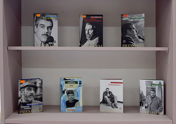 Выставка включает в себя сборники произведений С. Довлатова, статьи о биографии и творчестве писателя.
