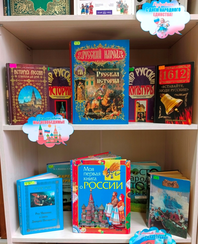 День народного единства – это дань памяти нашей славной истории. А книги – это хранители истории и культуры. Выставка посвящена историческому подвигу русского народа, преодолевшего смертельную угрозу внешней агрессии и внутренние раздоры. Здесь вы найдете уникальные публикации, посвящённые легендарным фигурам – князю Дмитрию Пожарскому и земскому старосте Кузьме Минину, сыгравшим решающую роль в освобождении столицы и возрождении российской государственности.