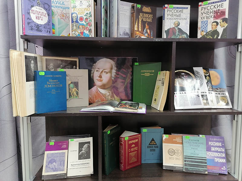 Также на выставке представлена литература о великом русском учёном М.В. Ломоносове. Подробно освещена его роль в развитии русской и мировой науки. Прослежено влияние его идей на последующие поколения отечественных учёных.