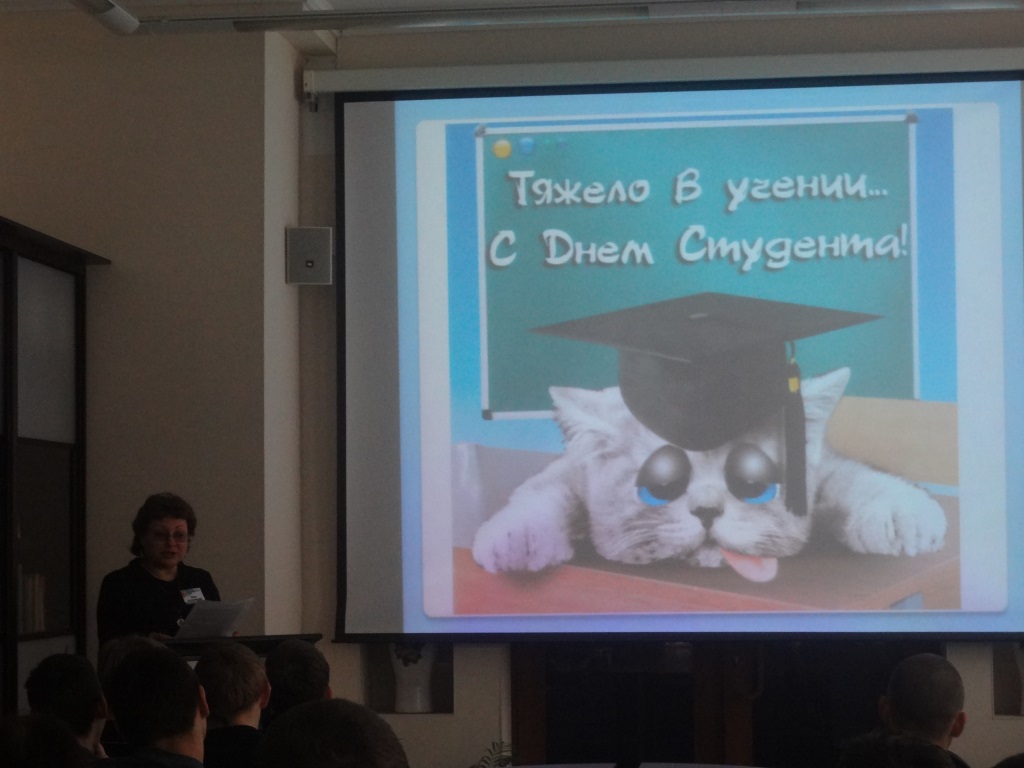 Студентам МГСТ поведали историю Святой великомученицы Татианы, рассказали об истории Международного дня студентов и о том, как отмечался День студентов в далёком XIX веке. Удивили и повеселили сегодняшние «грызущие гранит науки» «глубоким» знанием студенческих традиций и примет. Все с удовольствием посмотрели видеоролики, в которых участники игры КВН показали свои сюжеты из жизни студентов.