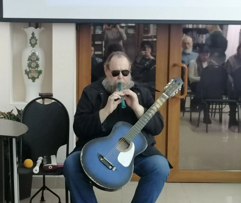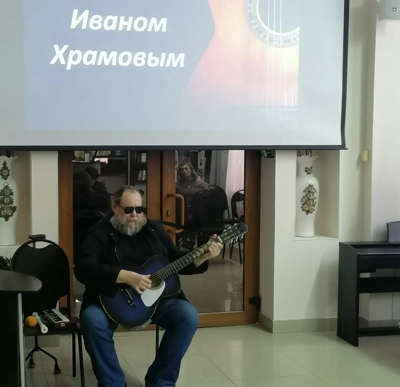Встреча началась с краткого рассказа Ивана Александровича о своём жизненном пути, музыкальной и поэтической карьере. В возрасте двух месяцев он потерял зрение и с тех пор видит лишь три процента, однако это не помешало ему самостоятельно освоить пять музыкальных инструментов.