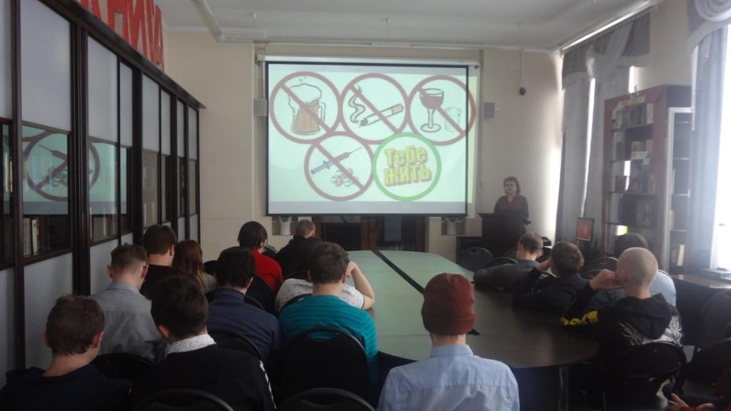 Библиотекарь Арзамаскина И.В. с помощью презентации рассказала о губительном влиянии на здоровье человека табака, алкоголя и наркотиков. Более подробно остановилась на составе сигарет, СПАЙСов, энергетических напитков и пива. Ребята узнали о Законе «Об охране здоровья граждан от воздействия окружающего табачного дыма и последствий потребления табака», об административной ответственности за распитие алкогольных напитков в общественных местах. Молодых людей познакомили с уголовной ответственностью за потребление, хранение и распространение наркотиков, в том числе СПАЙсов.