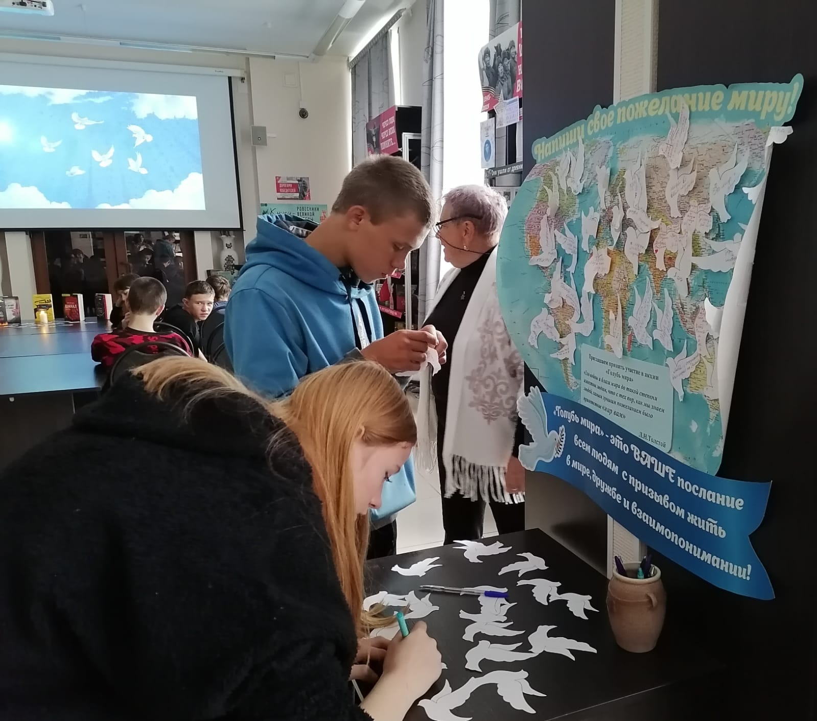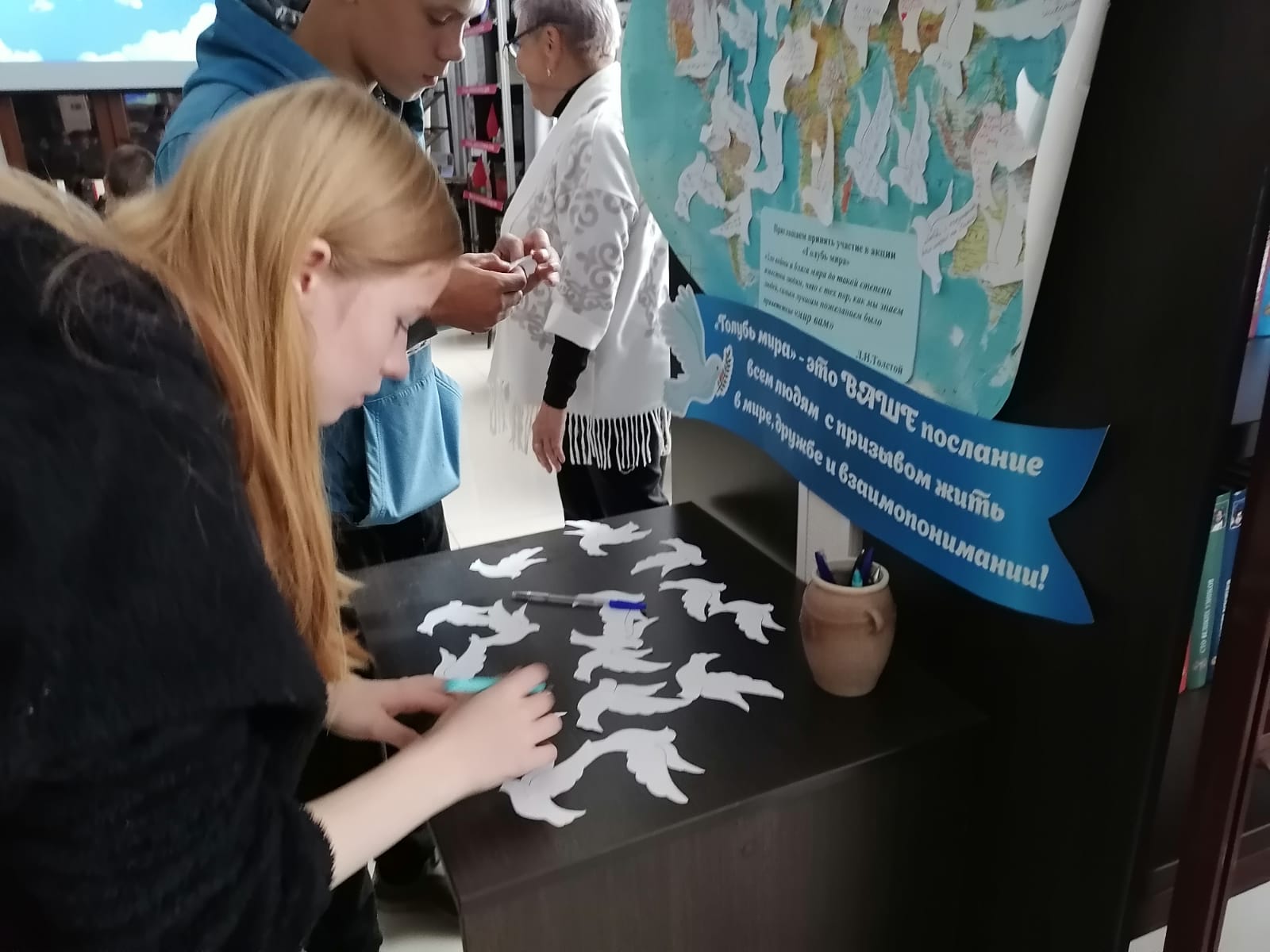 В завершение мероприятия участники встречи провели акцию «Мы хотим в мире жить!». В ходе акции каждый мог выразить свое мнение о том, почему он за мир и против террора. Свои тексты они поместили на бумажных белых голубях, которые потом они прикрепили на плакат, где были изображены земной шар, небо и солнце.