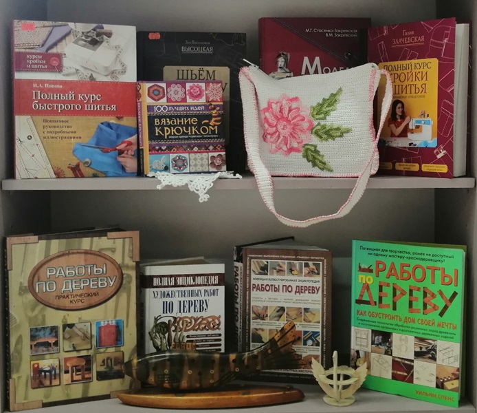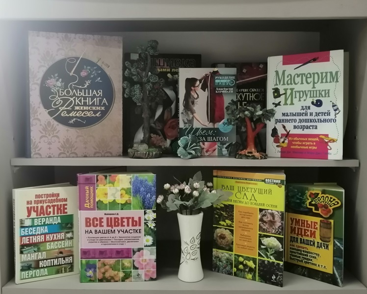 На книжной экспозиции представлено много интересных и познавательных книг по садоводству, ландшафтному и интерьерному дизайну, вязанию, вышиванию, изготовлению мебели своими руками.