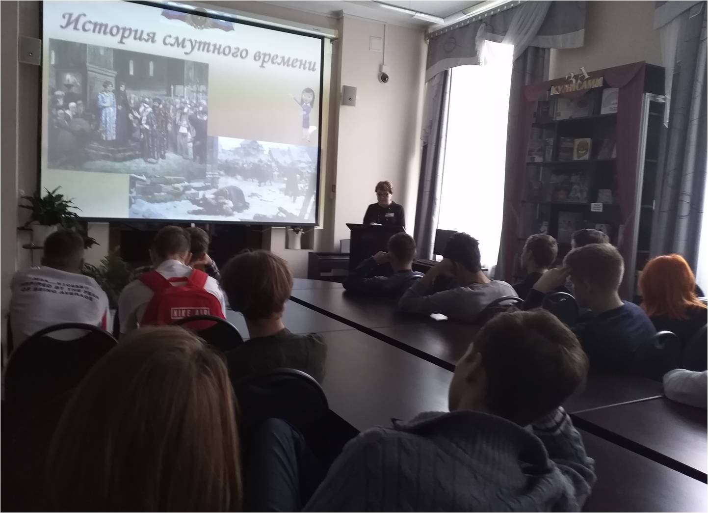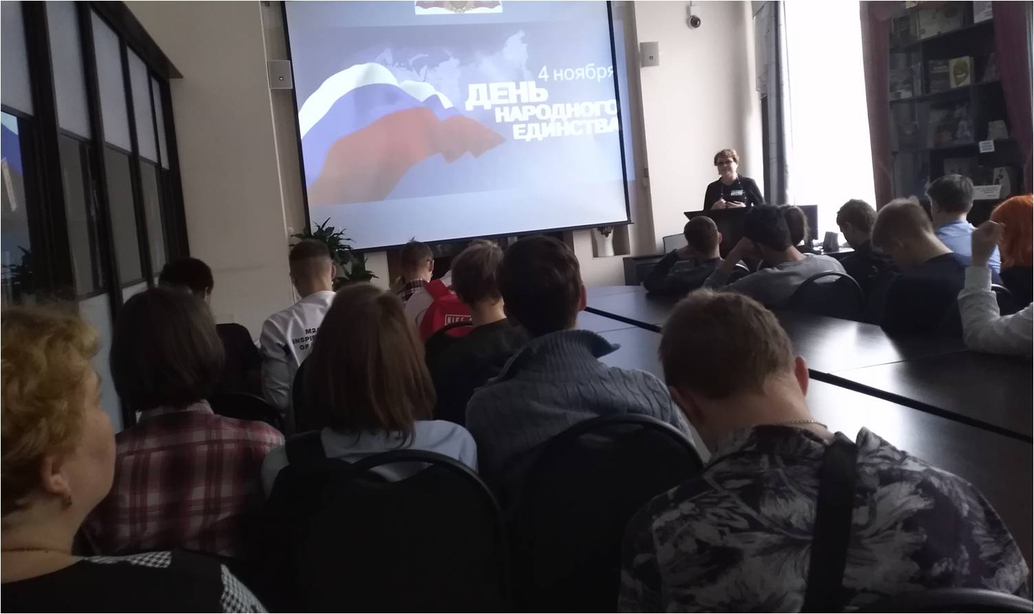 День народного единства – это праздник, установленный в память об освобождении Москвы народным ополчением от польских интервентов в 1612 году. Библиотекарь познакомила студентов МГСТ с ключевыми фигурами Смутного времени Кузьмой Мининым и Дмитрием Пожарским, рассказала о событиях 400-летней давности, в результате которых Москва была освобождена от польских захватчиков. Те далёкие события и стали основой мощного, единого, сплочённого российского государства.