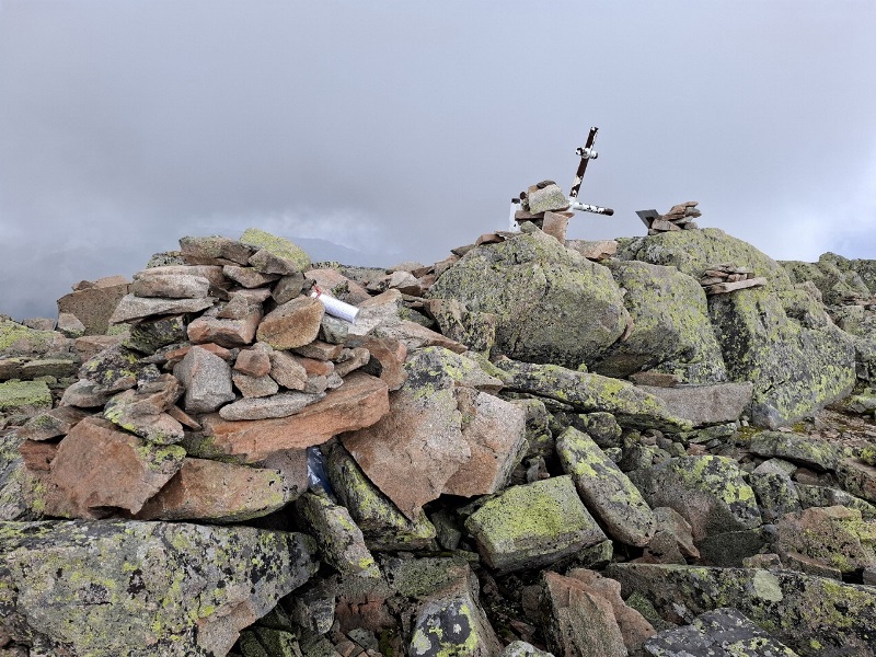На вершине стоит металлический крест, вершинные туры и памятные таблички.