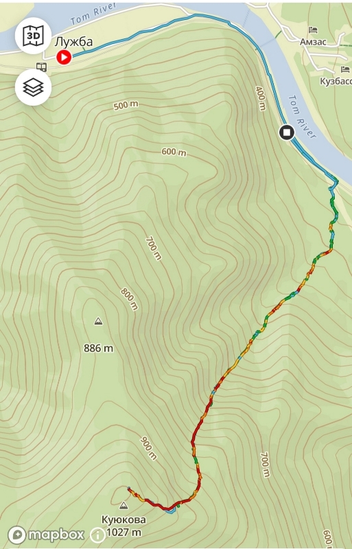 Едем на электричке до ст.Лужба. Вершина находится на левом берегу р.Томь. Переправляться через реку не надо. Двигаемся от станции вдоль железной дороги вверх по реке, минуя лодочную переправу и ж/д галерею. Тропа на вершину начинается от первого высоковольтного столба за галереей, чуть дальше сторожки путейцев.