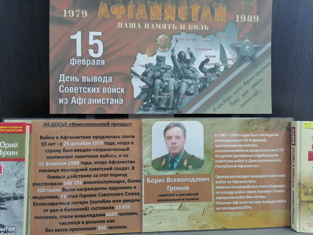 15 февраля 1989 года завершился вывод советских войск из Афганистана. Памятная дата установлена, чтобы напомнить об этом событии, а также в память о более 14 тысячах советских солдат и офицеров, не вернувшихся с афганской войны. Выставка, организованная к этой дате, отражает боевое прошлое тех, кто до конца выполнил свой интернациональный долг. Читатели могут познакомиться со стихами авторов, свидетелей той войны, документальными и художественными произведениями, фотодокументами. Представленные книги помогут расшифровать многие таинственные и драматические моменты войны и того, что ей предшествовало. Также выставку дополняют книги, посвященные кузбассовцам, прошедшим дороги Афганистана.