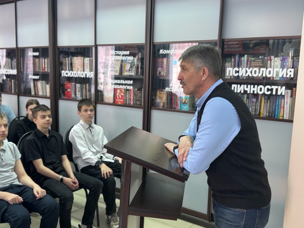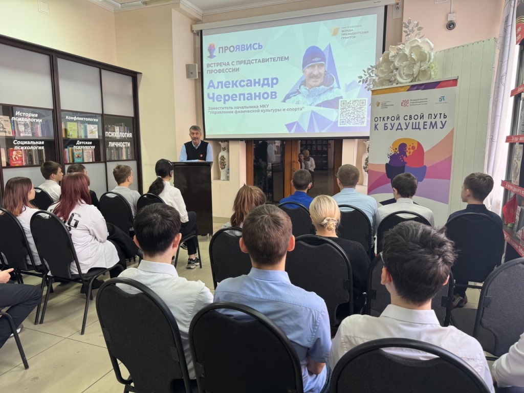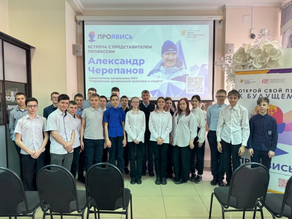8 апреля в Центральной городской библиотеке в рамках проекта по профориентации школьники получили возможность пообщаться с заместителем начальника управления физической культуры и спорта Александром Владимировичем Черепановым.
