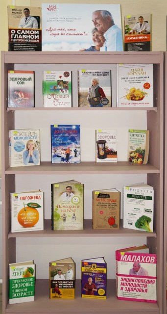 На выставке представлены книги, содержащие рецепты молодости, здоровья и долголетия. Издания о том, как прожить жизнь без таблеток, как сохранить бодрость, какие существуют мифы о продлении активной жизни, как жить полноценной жизнью, не взирая на возраст. Среди них «Энциклопедия молодости и здоровья: продление жизни, эффективное лечение, самооздоровление» Геннадия Малахова, повествующая о выборе своего пути оздоровления, об омолаживающих гимнастиках, об очищении голоданием; книга доктора Александра Мясникова «Ржавчина», содержащая подробную информацию о том, как сохранить здоровье самого главного органа каждого человека – сердца, а также издание одного из самых успешных психологов и самых читаемых авторов в мире Эды Ле Шан «Когда ваш возраст сводит вас с ума. Книга-лекарство для человека любого возраста», рассказывающая как прожить вторую половину жизни полно – интеллектуально, социально и эмоционально, насыщенно, спокойно и уверенно, в радости и богатстве, которыми обладают наш драгоценный возраст и наша нестареющая душа.