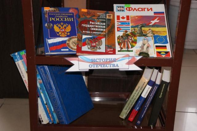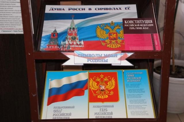 На выставке представлена Конституция РФ, с изменениями, принятыми на Общероссийском голосовании 1 июля 2020 года (+ сравнительная таблица изменений к ней); книги об истории, символике страны.
